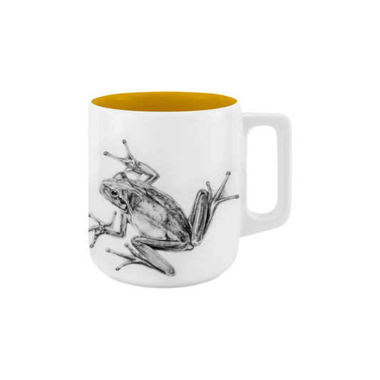 becher mit henkel . innen farbig . blaumeise auf ast .