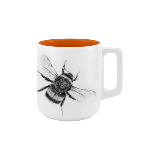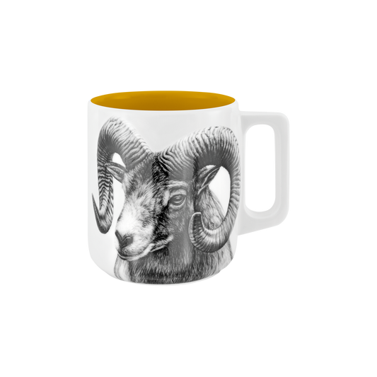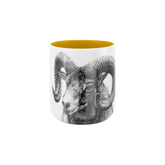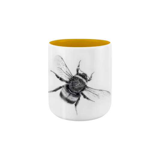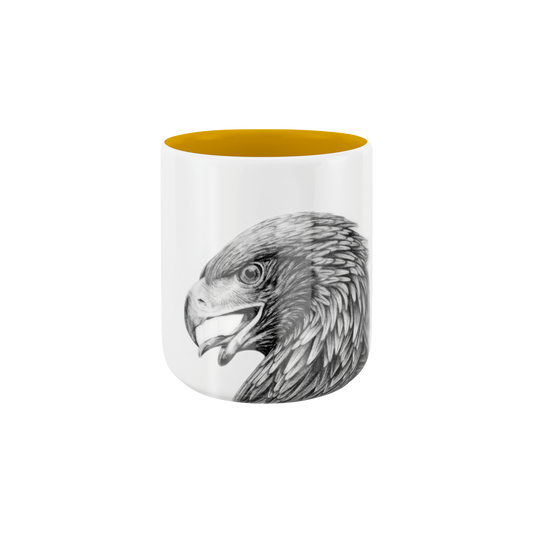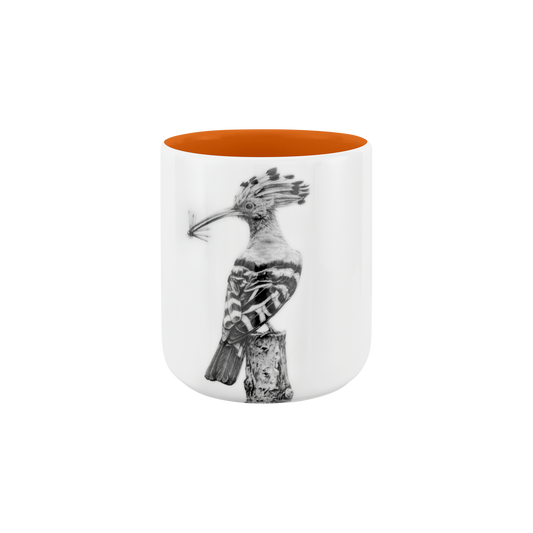 becher mit henkel . innen farbig . wiedehopf auf ast .