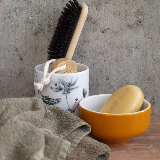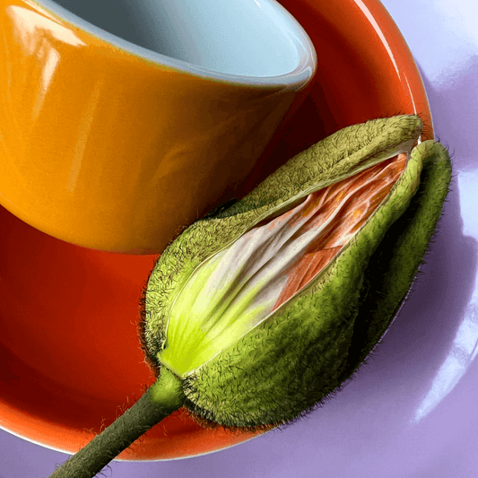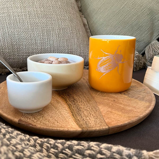 becher ohne henkel . honig im tee . handgespritzt außen .