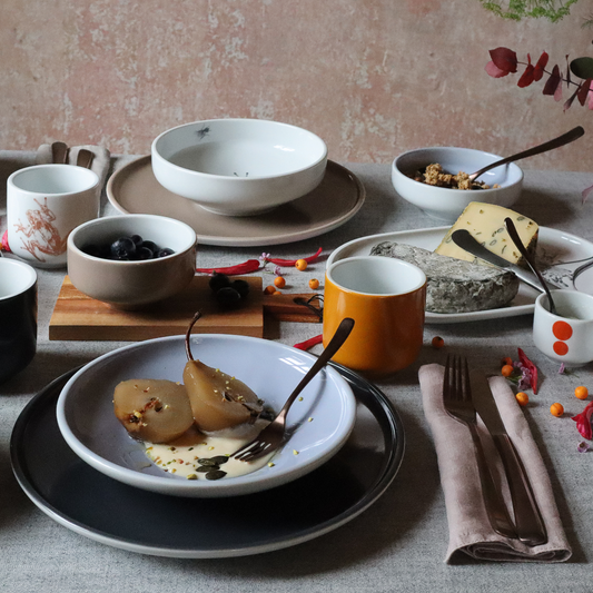 teller 21 tief . honig im tee . handgespritzt .