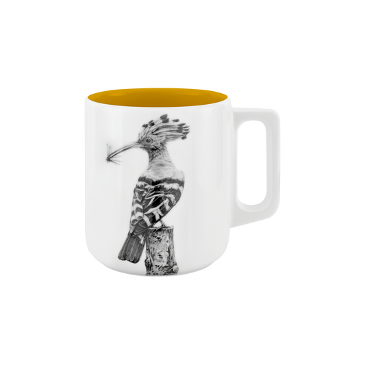 becher mit henkel . innen farbig . wiedehopf auf ast .