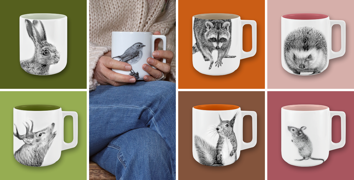 becher mit henkel . innen farbig . waschbär .