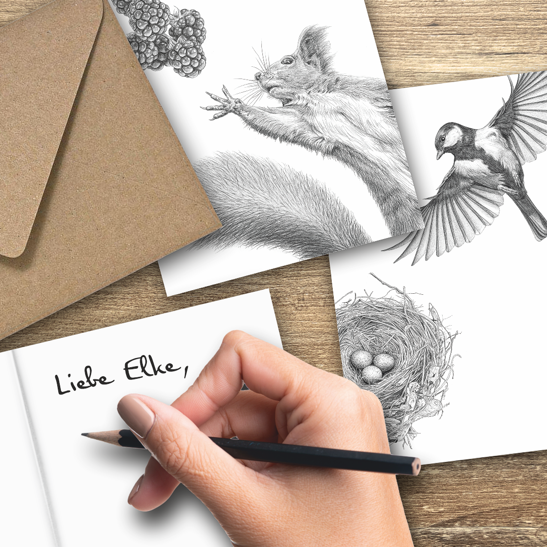 klappkarte mit umschlag . eichhörnchen greift brombeeren .