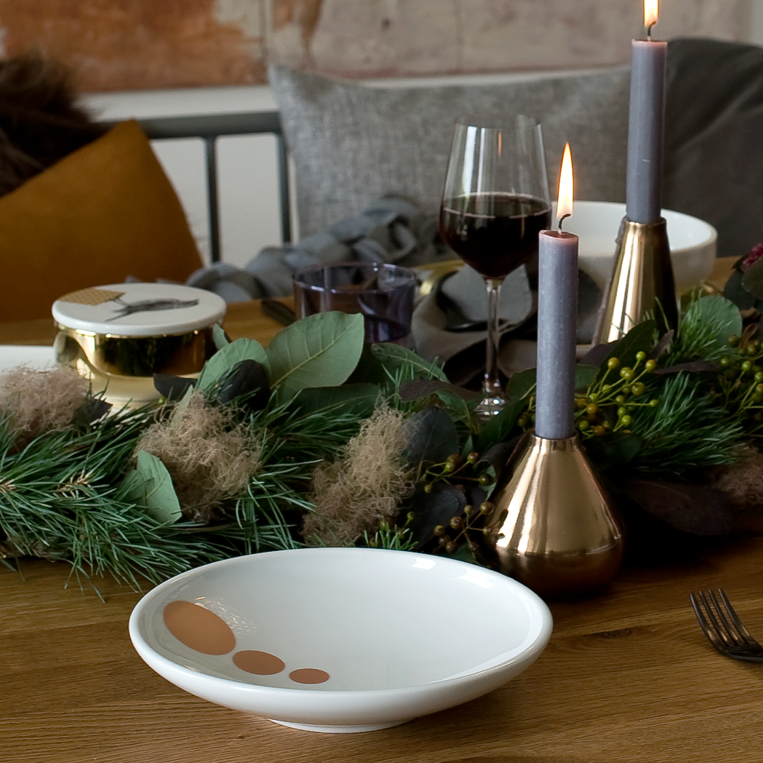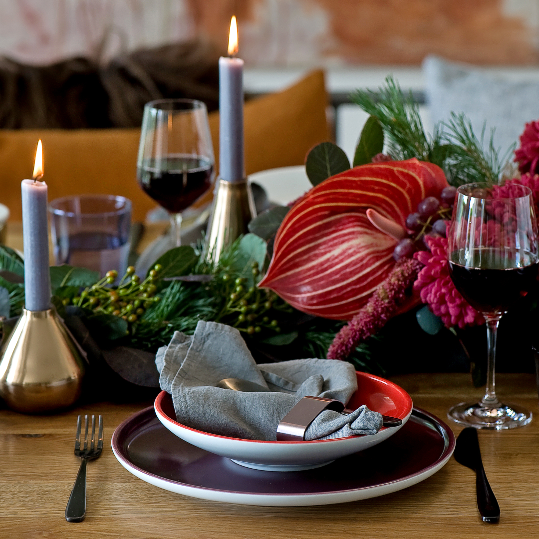 erlebe die atmosphäre der festlichen jahreszeit mit rottönen von traditionell-kräftig bis zu tief-dunkel kombiniert mit hochglänzendem gold und kupfer. so entsteht eine atmosphäre von warmer eleganz. klassisch und absolut zeitlos.